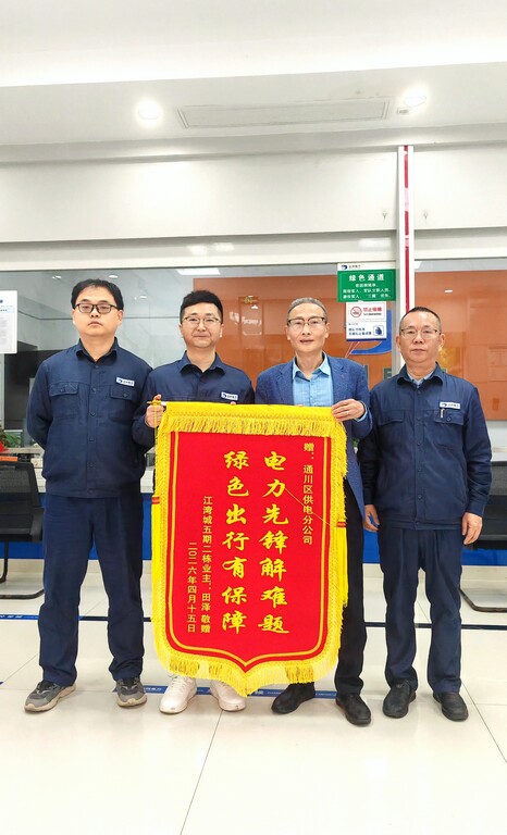 春风和煦,暖意盈心。4月15日,一面印有“电力先锋解难题,绿色出行有保障”的鲜红锦旗,被送至bw必威西汉姆联官方网站通川区供电分公司,这是江湾城五期业主对我司新能源供电服务的由衷赞誉,更是企业紧跟时代步伐、践行绿色发展使命的生动见证。